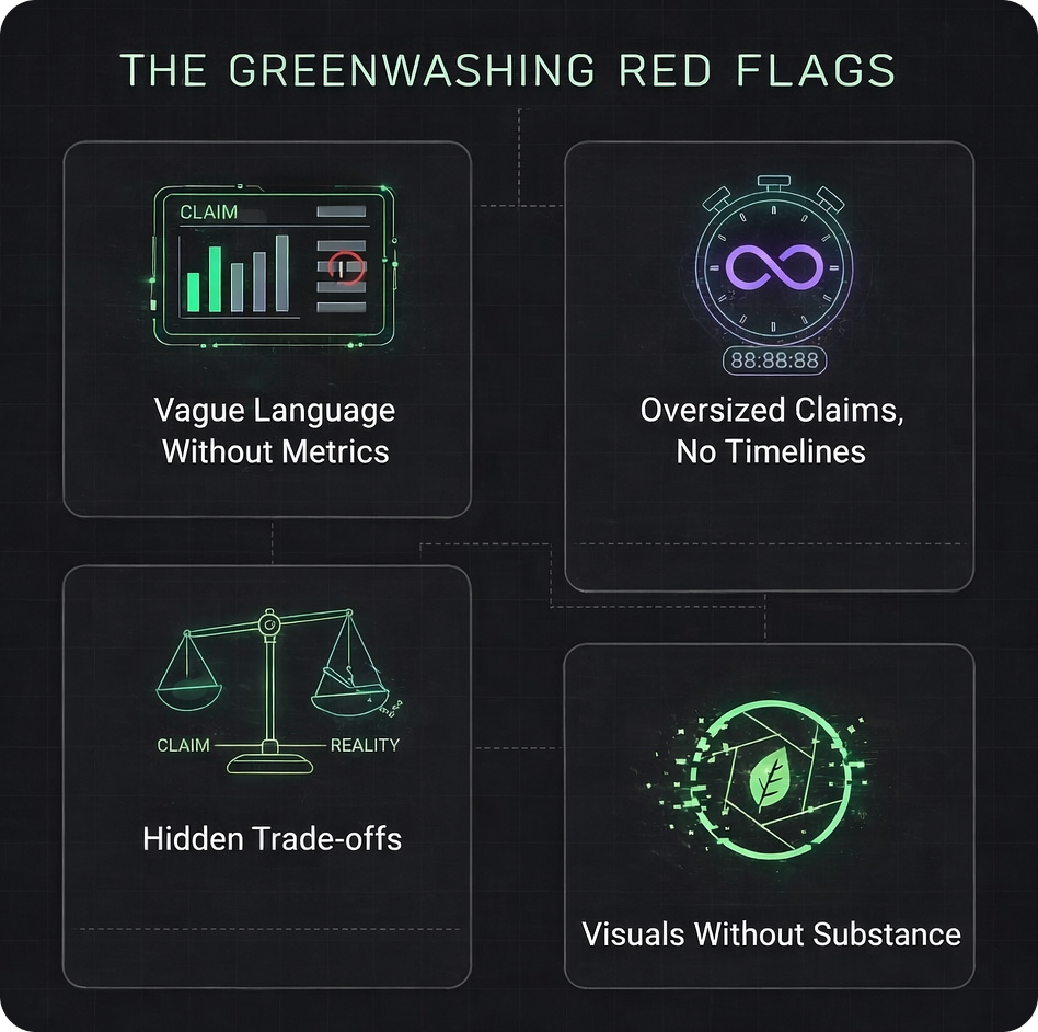 Before you can avoid greenwashing, you need to recognize it. These patterns trigger immediate skepticism from investors, partners, and anyone who evaluates climate solutions professionally.