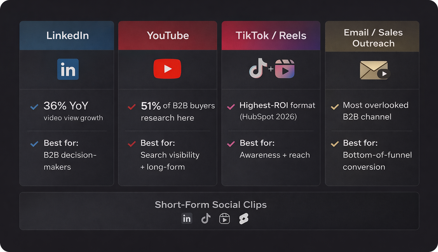 A B2B video marketing strategy is a structured plan that matches specific video formats to each stage of the buyer's journey, then distributes that content where decision-makers spend time. In 2026, that means LinkedIn, YouTube, and short-form platforms. Not random content. Targeted video that moves prospects from awareness to closed deal.