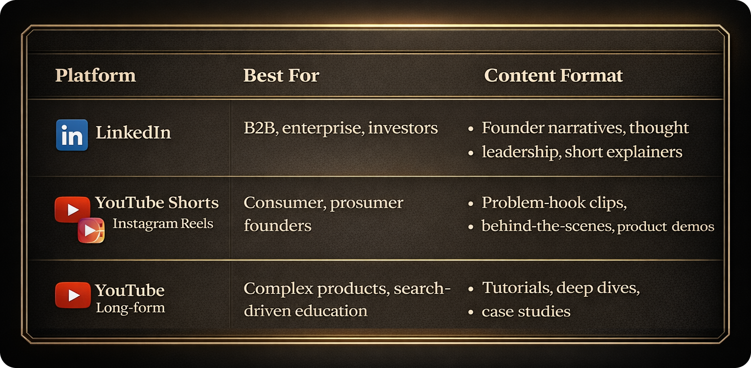 LinkedIn's native video currently receives 3x the reach of text posts, making it the highest-leverage starting point for most B2B founders. Short-form video specifically has become the dominant format for B2B startups because the barrier to entry is low and the distribution upside is high.