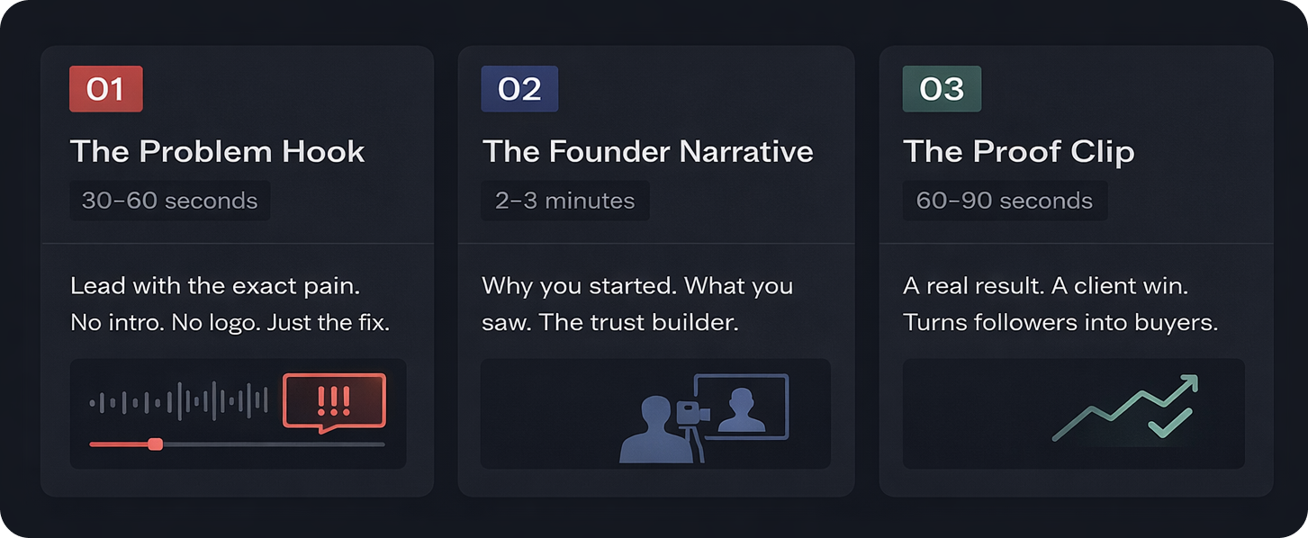 A real result. A client win, a metric, a before-and-after. This is what turns followers into buyers. Social proof in video format converts at significantly higher rates than written testimonials alone.