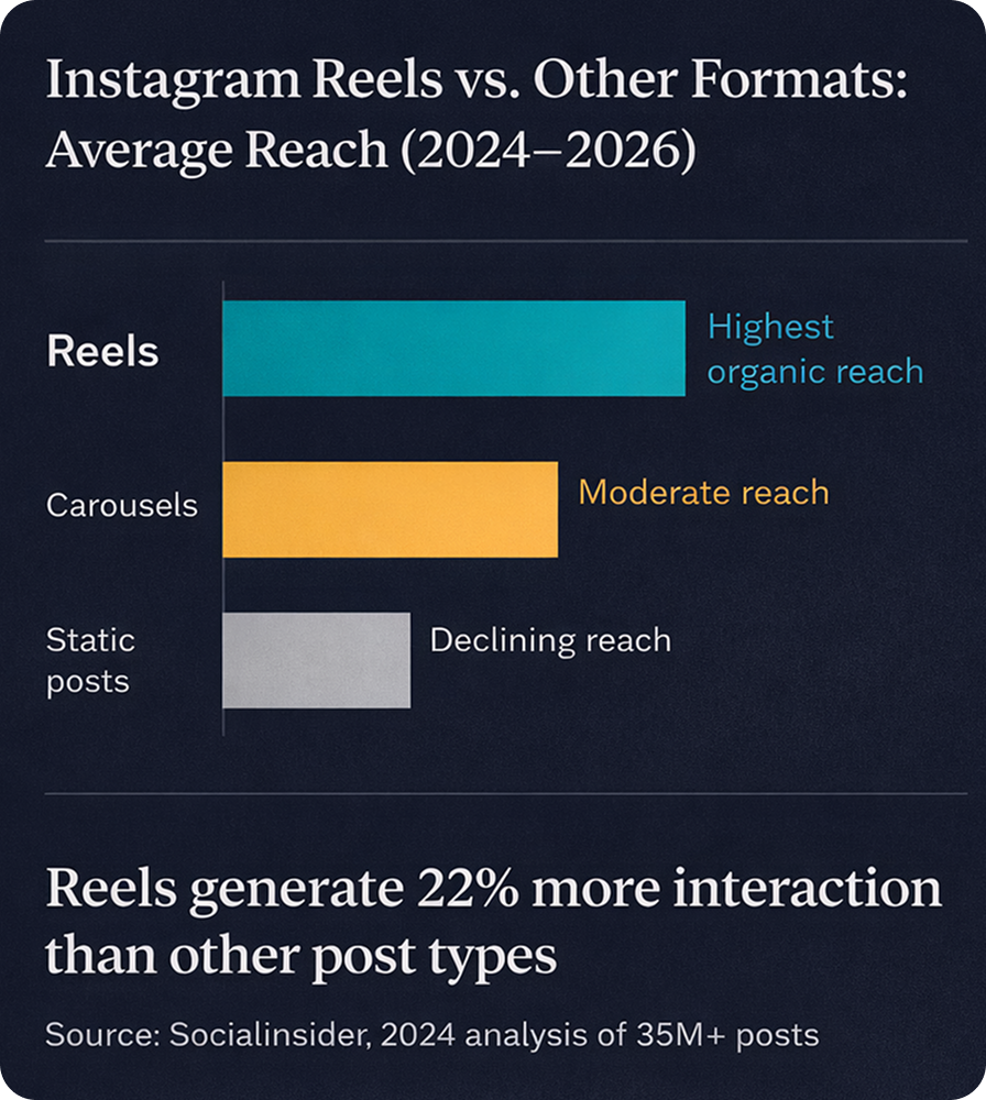Instagram Reels generate, on average, 22% more interaction than other post types, according to a 2024 Socialinsider analysis of over 35 million posts. That gap has only widened going into 2026 as the platform continues to deprioritize static content in the feed.