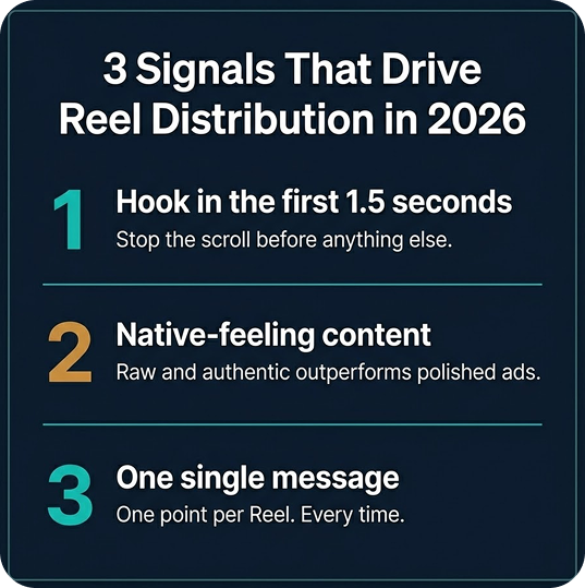 Every Reel should carry one point. One takeaway. One reason to follow, save, or share. Cramming multiple messages into a short clip kills watch time and confuses the algorithm's distribution signals.