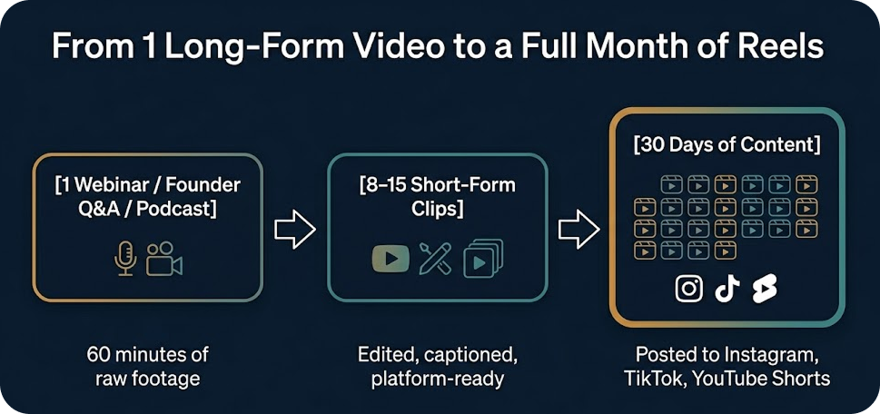 One piece of long-form content, such as a webinar, podcast episode, or founder Q&A, can be turned into 8 to 15 short-form clips. That is a full month of Reels from a single filming session. The brands growing fastest on Instagram right now are not creating more content. They are making smarter use of what they already have.
