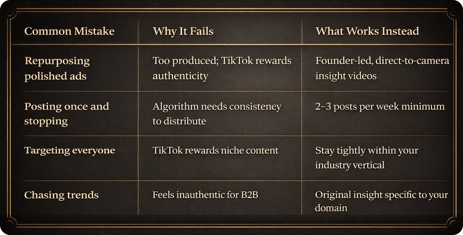 Most tech companies either repurpose polished brand ads (wrong format for TikTok) or post once, see modest numbers, and quit (wrong timeline for any platform). TikTok rewards consistency and niche specificity, not production budget.