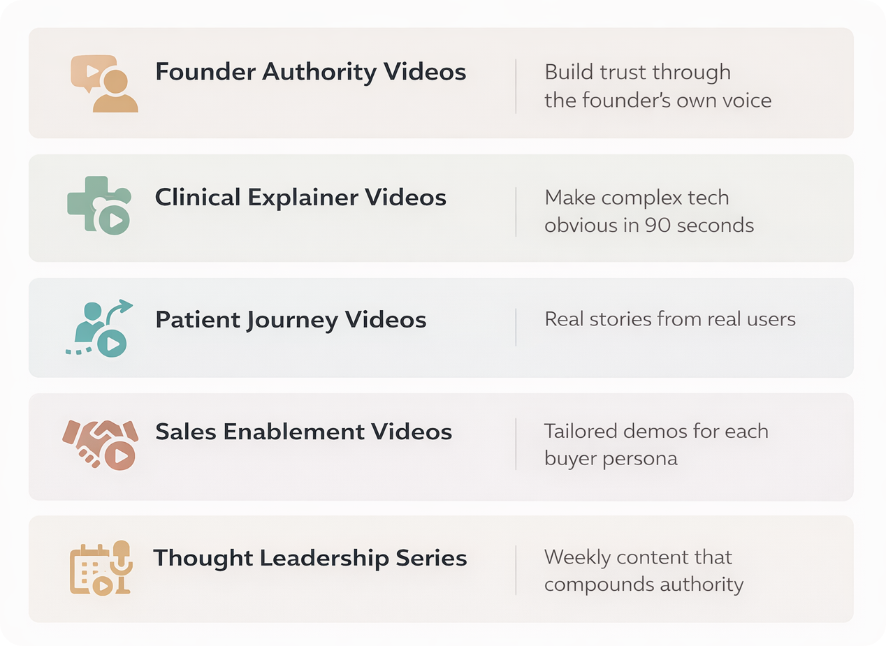 1. Founder Authority Videos. Short-form clips where the founder explains the "why" behind the product. Think 60-second LinkedIn videos addressing a real clinical pain point. This is where founder-led video becomes a long-term growth engine.